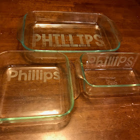 We charged $2 per dish etched and we did about 25 dishes total. Most people did a few dishes each. We said they could do a 9x13, a 9x9, a 6x10, or a bread pan. Most signed up for the 9x13 option and a few signed up for the 6x10 or 9x9 options, but no one signed up to do a bread pan. In addition to dish size, they had to sign up for what name they wanted etched and what font they wanted. I had 3 font options.